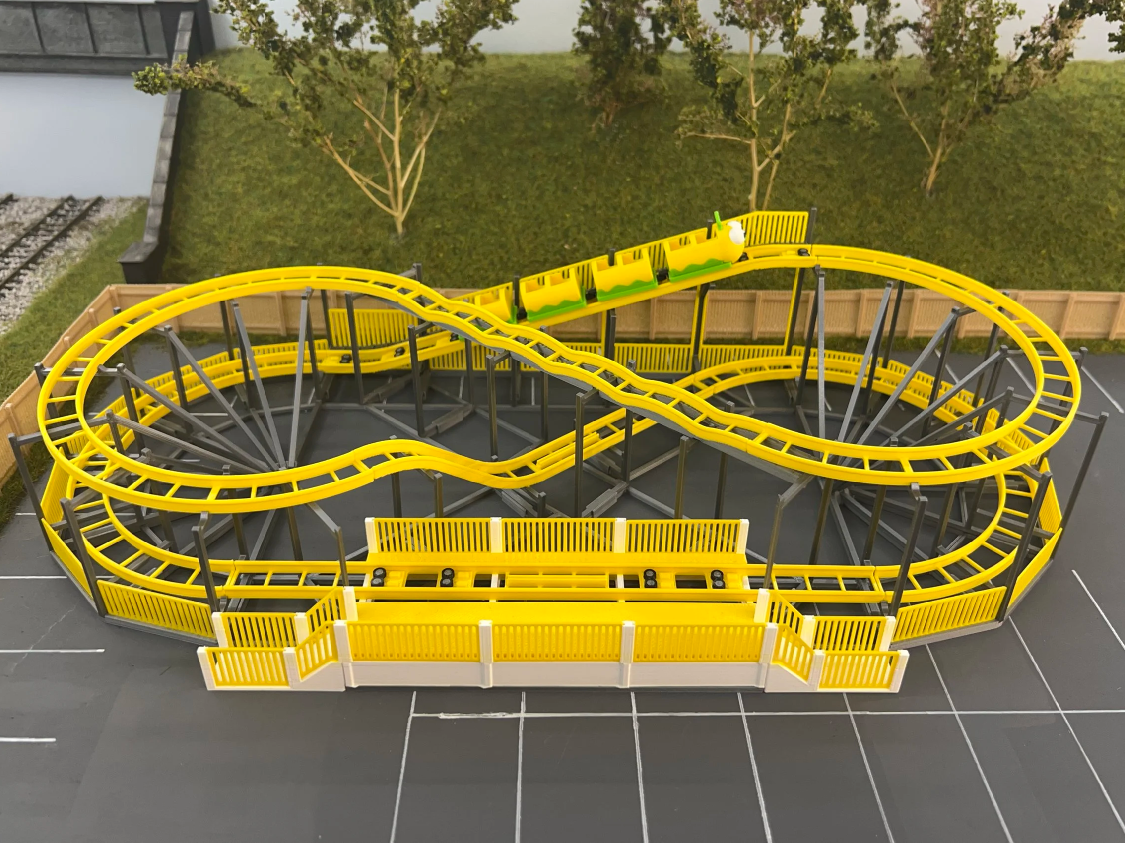 This OO Gauge kit includes all the 3D printed plastic parts required to build the rollercoaster. This includes: Ground-frame, Supports, Track, Station Platform, Train and Fences. This model includes bright yellow track and a Green/Yellow train.